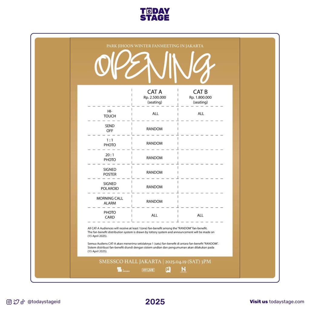 If you’re interested in having fun with Park Jihoon at the “OPENING” fan meeting, be ready for the ticket rush. Tickets are available now on amazingtiket.com, starting on Tuesday (February 11, 2025) at 7:00 PM WIB. Don’t miss out!