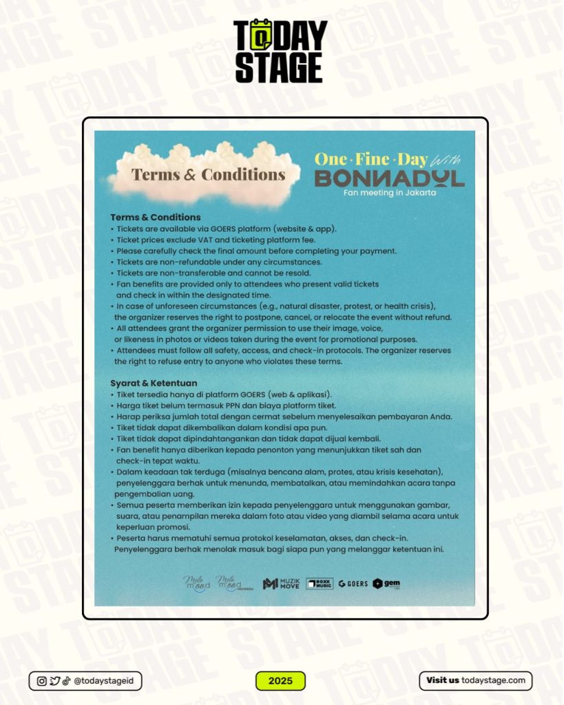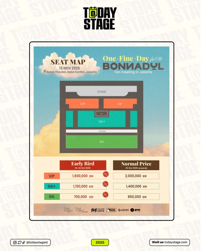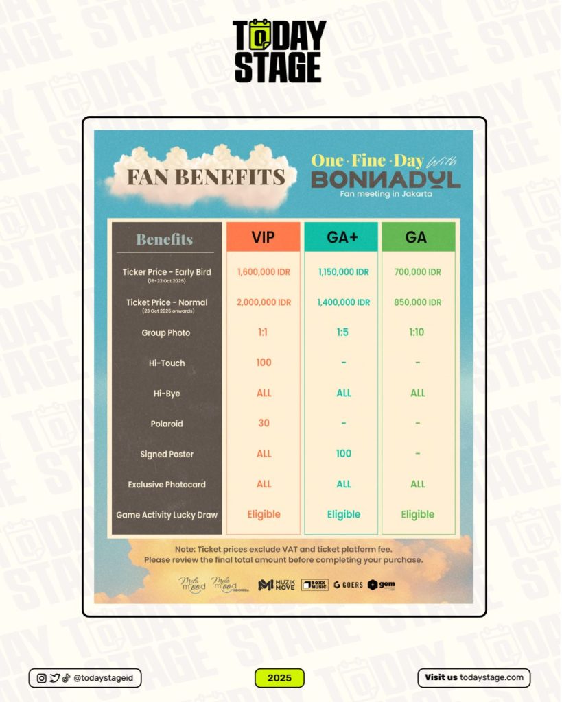 The fan meeting is scheduled to start at 5:00 PM (WIB), with doors opening at 4:00 PM. Tickets are available for purchase through www.goersapp.com/event/bonnadoljakarta. Each ticket category offers different benefits — from a Hi-BYE session for all ticket holders to exclusive gifts, as well as opportunities to bring home posters, cards, group photos, autographs, and other memorable souvenirs.
