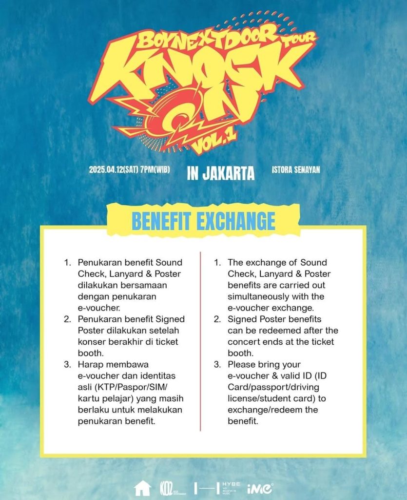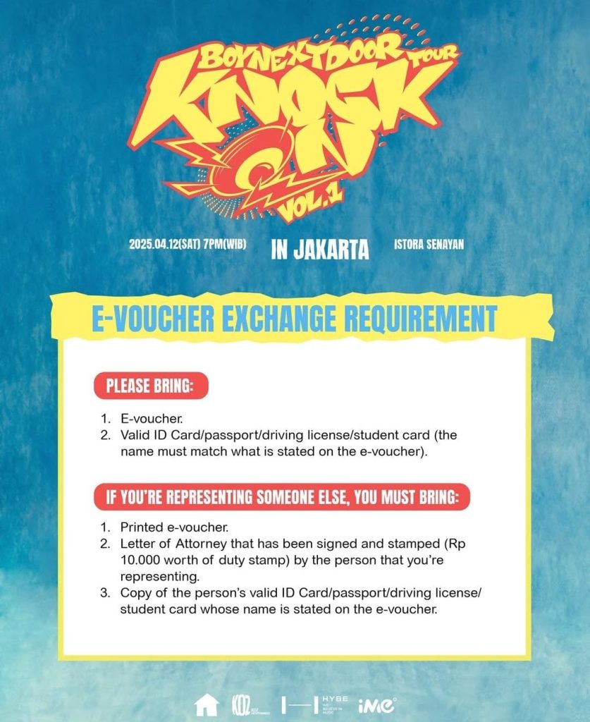 Concert ticket redemption can be done on April 12, 2025, at Istora Senayan from 08:00 to 19:00 WIB. During ticket redemption, make sure to bring the E-voucher and a valid ID (KTP / Passport / Driving License / Student Card), ensuring the name matches the one on the E-voucher.