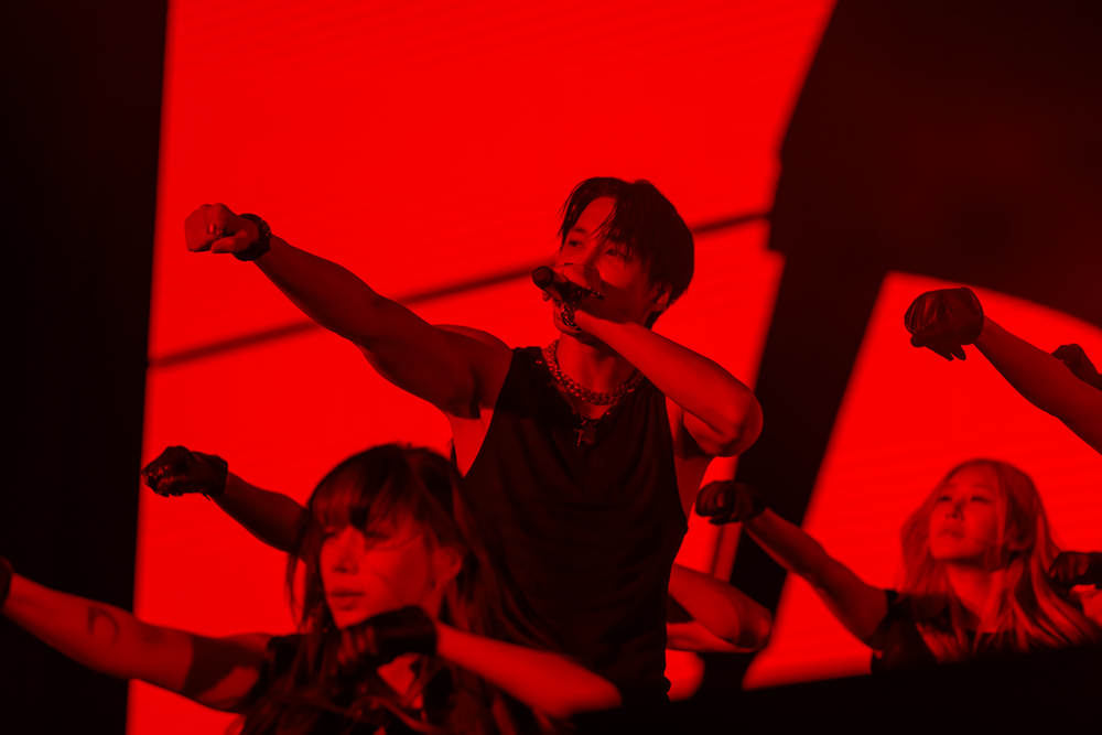 Without pause, Kai transitioned into “Nothing On Me,” a groovy track elevated by powerful arrangements and explosive dance moves. His opening set became even more dazzling thanks to a bold red outfit with a striking V-neck cut that drew gasps from the audience. Every movement showed the artistry of a confident, magnetic soloist.
