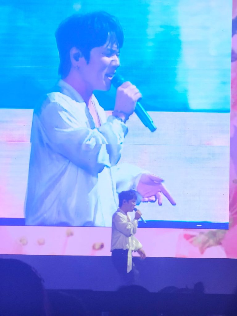 He even echoed fans yelling “PDKT” (a slang for courtship), creating a humorous and intimate moment. He continued with beautiful renditions of “Rain and You,” “Sweet” (Business Proposal), and “Episode,” accompanied by dreamy pink visuals.