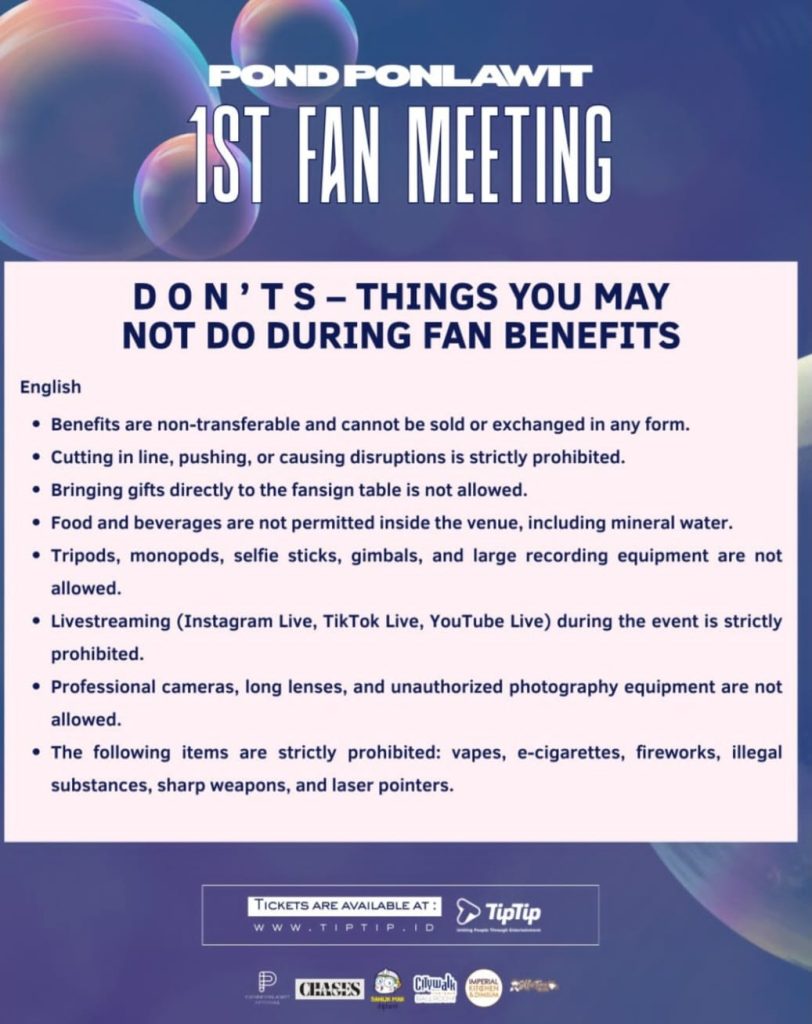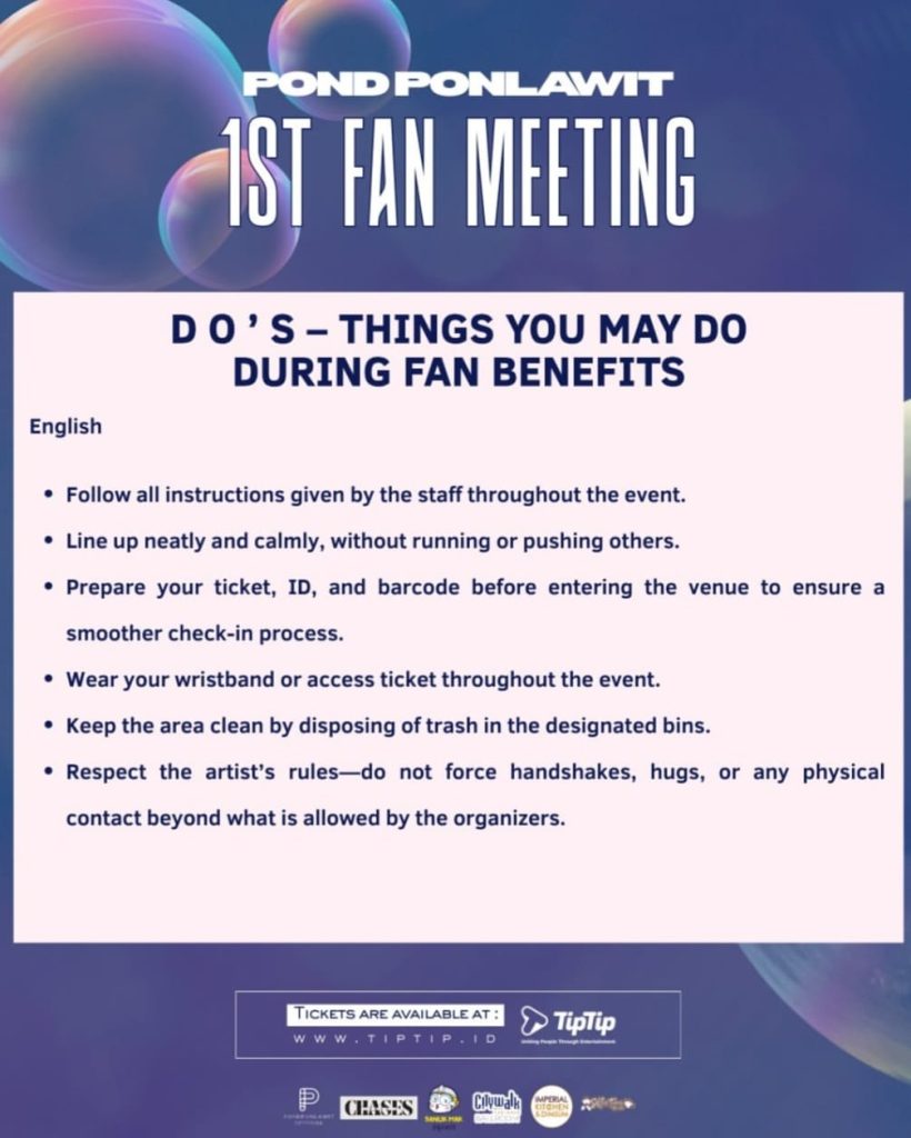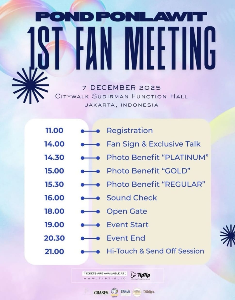 With a complete lineup of activities—from fansign sessions and photo benefits to a final hi-touch moment—Pond Ponlawit’s first fan meeting in Jakarta is set to be one of the most exciting fan events closing out 2025. For Indonesian fans who’ve been eagerly waiting, this is a rare chance to interact closely with Pond and create unforgettable memories.