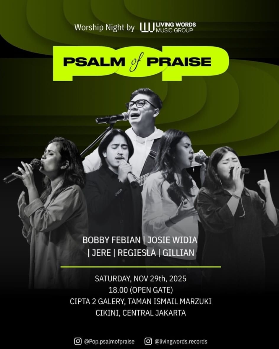 Psalm of Praise, a Worship Night event organized by Living Words Music Group, will be held on Saturday, November 29, 2025, at Cipta 2 Gallery, Taman Ismail Marzuki, Cikini, Central Jakarta.