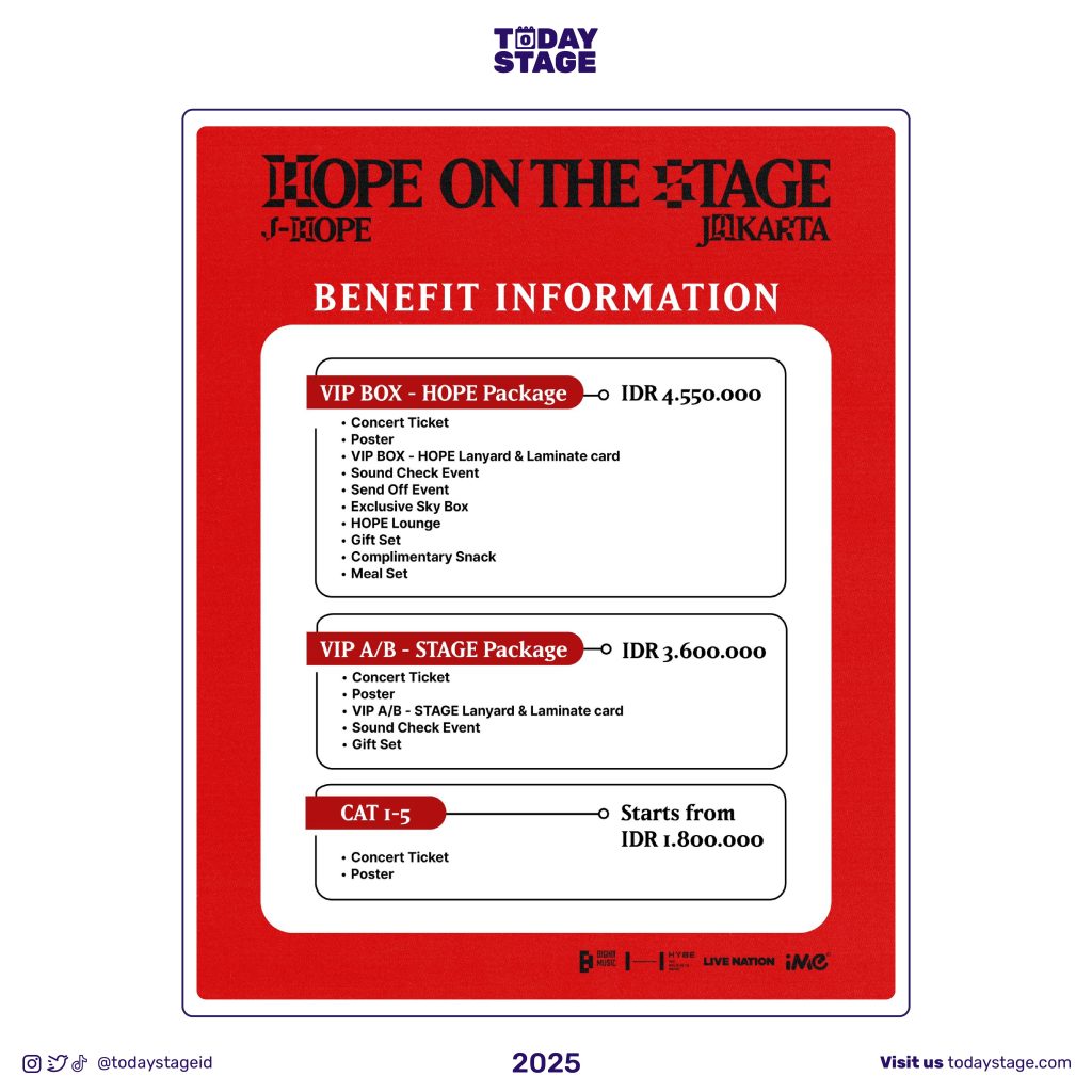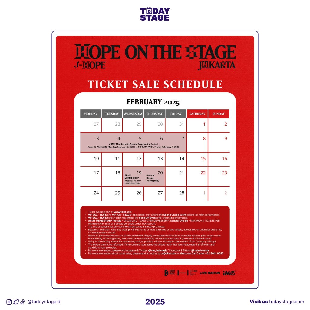 Known for his electrifying stage presence, unmatched artistry, and chart-topping hits, j-hope will bring his unique blend of music and dance to Jakarta as part of his 2025 world tour. Fans can look forward to a dynamic setlist featuring tracks from his critically acclaimed solo albums, such as Jack In The Box and HOPE ON THE STREET VOL.1, as well as special performances that highlight his multitalent as an artist.