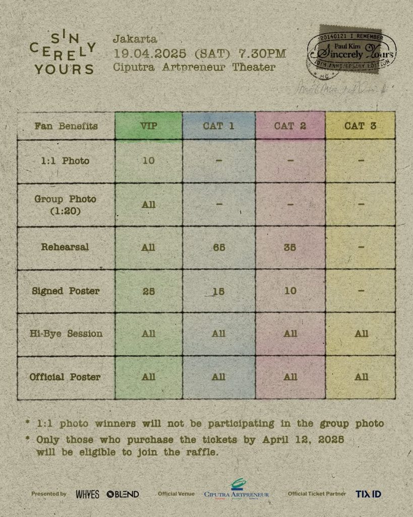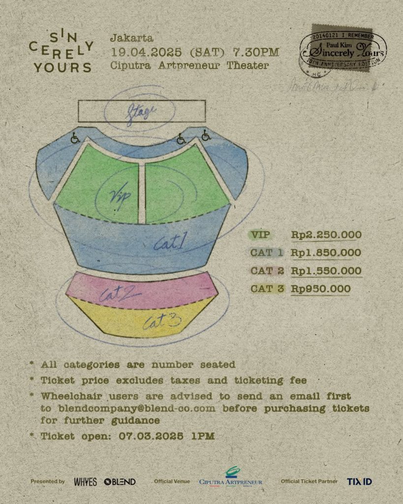 Blend Company, the promoter bringing Paul Kim to Indonesia, has finally announced the ticket prices and location for his Sincerely Yours concert, which will take place on April 19, 2025, at the Ciputra Artpreneur Theater in Jakarta.