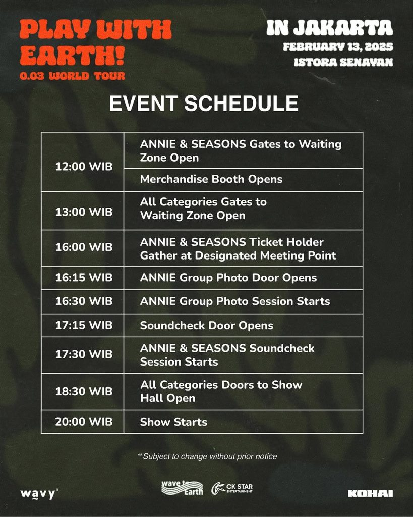 Wave to Earth Play with Earth! 0.03 World Tour in Jakarta will take place on February 13, 2025, at 8:00 PM WIB, organized by CK Star ID.